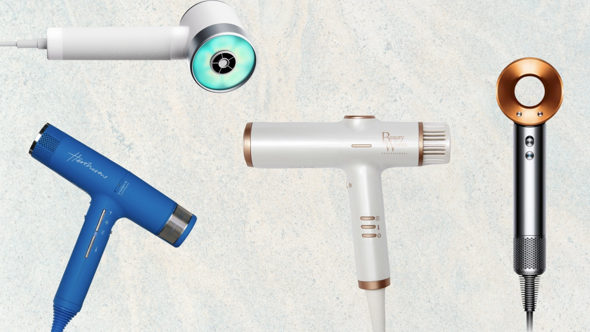 A selection of the quietest hair dryers we tested for this feature from (L-R) Bio:Ionic, Dyson, mdlondon, Zuvi and Beauty Works