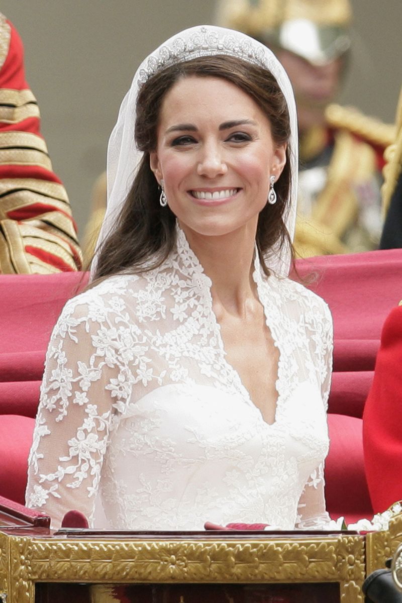 A suitably regal hairstyle, this smoothed-back middle parted look lets the sparkly tiara be the centre of attention. Tucking the hair behind the ears not only opens up Kate's face, but it also works to add extra thickness to the back of the head that prevents this straight style from falling too flat. A foolproof and elegant style, it is one of our favourites.