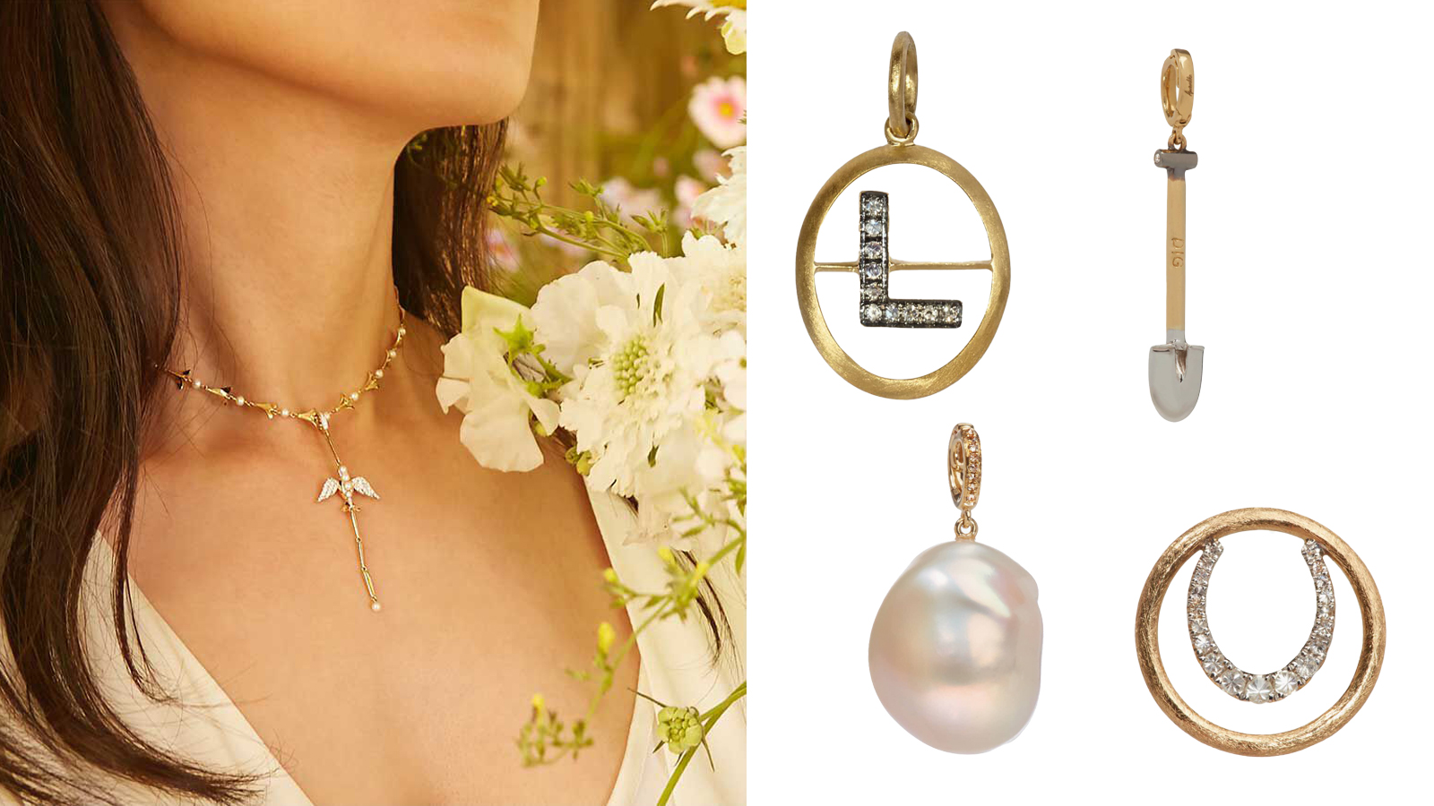 Slim gold rings sprinkled in diamonds, modern interpretations of pearl earrings, and collectible pendants that include cheeky gold ‘better half’ friendship bagels, pearl-studded cannoli, engravable 'Love Letter'.