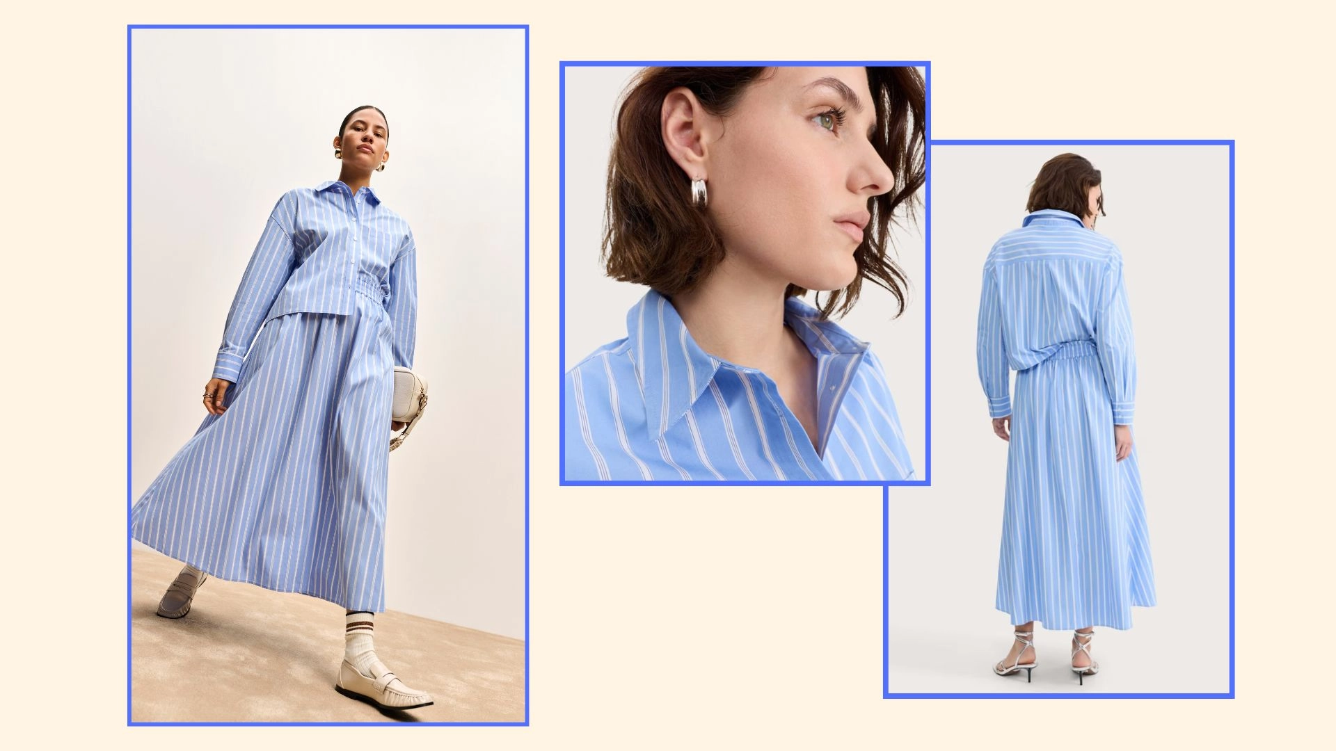 The pale blue and white striped shirt and skirt combination is such a winner for the warm weather, and it has a gorgeous, easy-breezy feel to it. The pieces are sold separately, and each half will look great when worn solo with other simple basics.