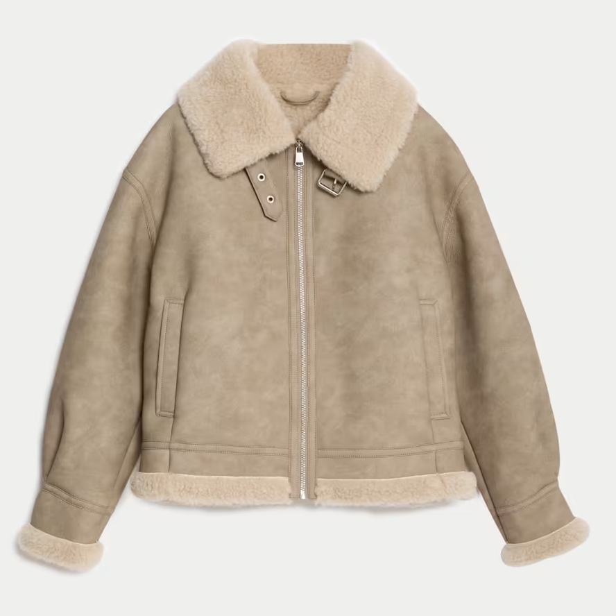 Thanks to the fluffy lining, a shearling-style aviator jacket always tends to have a traditional, relaxed feel to it that works so well with everyday outfits, though you could easily wear a jacket like Helen’s with a smarter jumper dress or co-ord too. She chose to layer hers over a black denim shirt and a pair of leather leggings for a put-together, comfortable look.