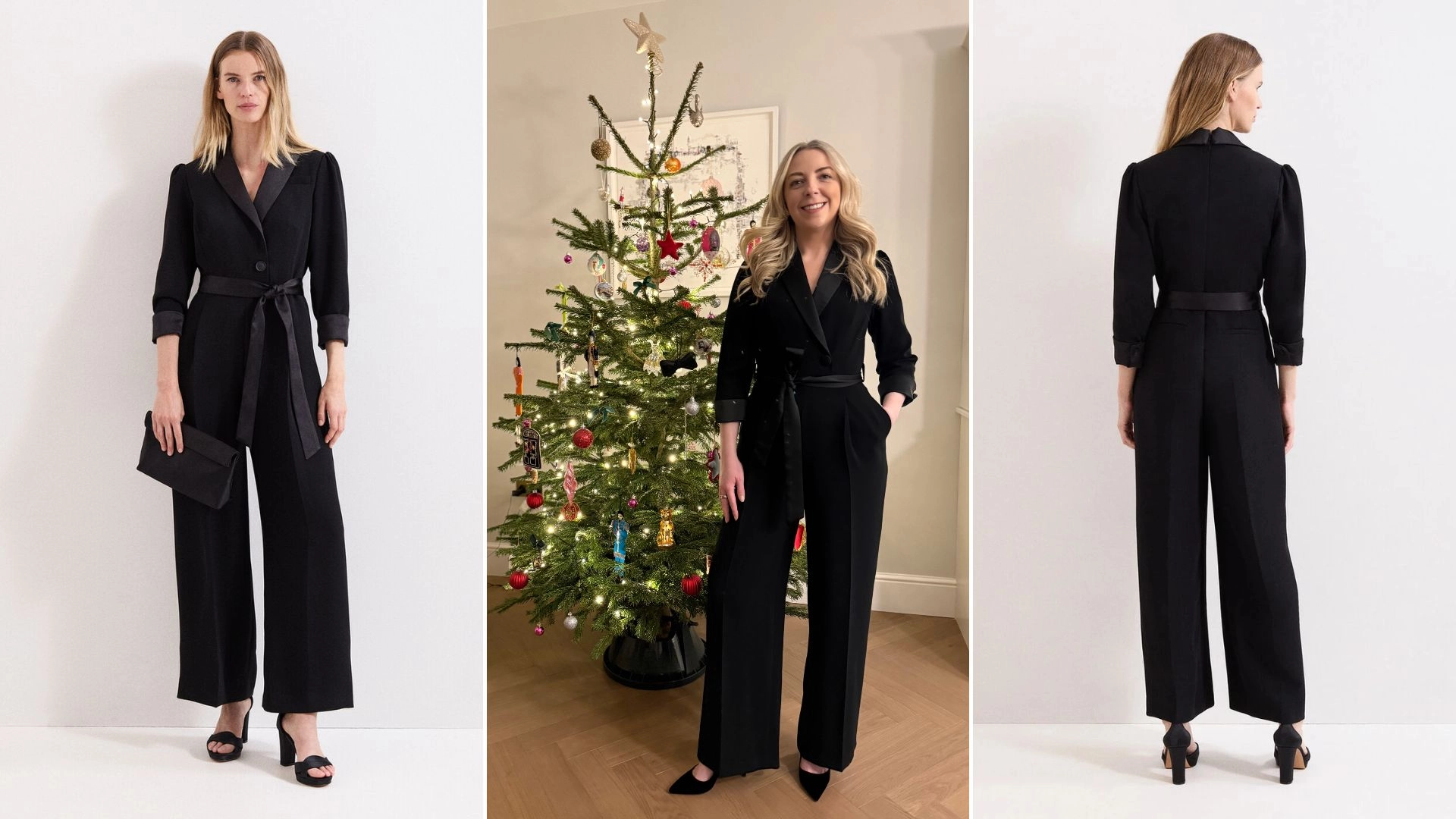 This wrap-over black all-in-one features tuxedo-inspired satin lapels, a tie belt and flattering wide-leg trousers. It's so easy to wear - the V-neck isn't too plunging, the bracelet-length sleeves make it warm and ideal for anyone who prefers to cover their upper arms (me), and all you need to consider is which shoes you'll wear.