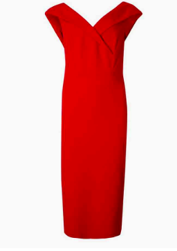 They continue, “Added stretch in the double crepe material helps it hug your curves, while the elegant off-shoulder neckline folds down the bust to create a truly stunning piece.”