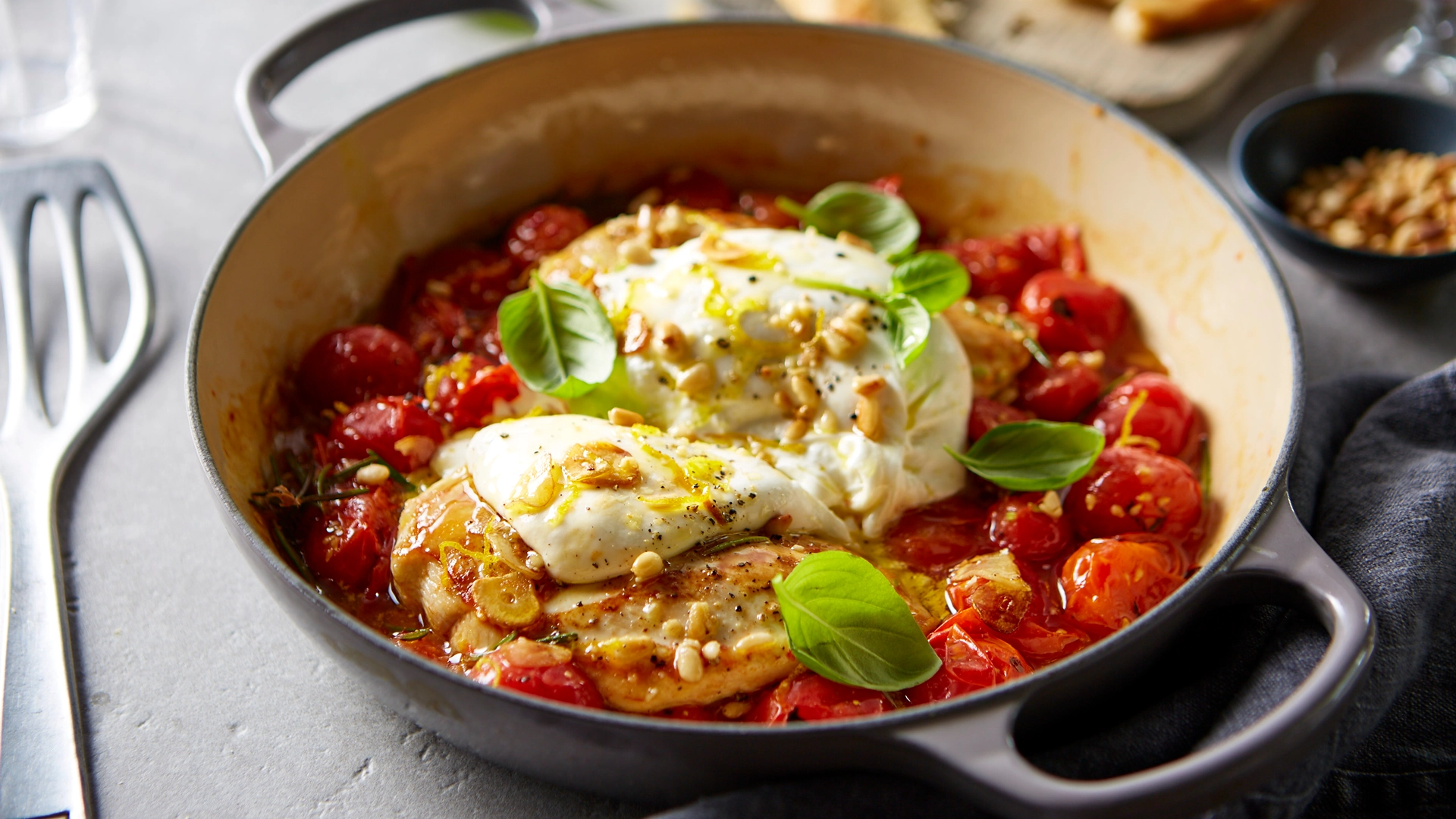 Elevate this simple midweek chicken dish with creamy Italian burrata and fresh basil.
