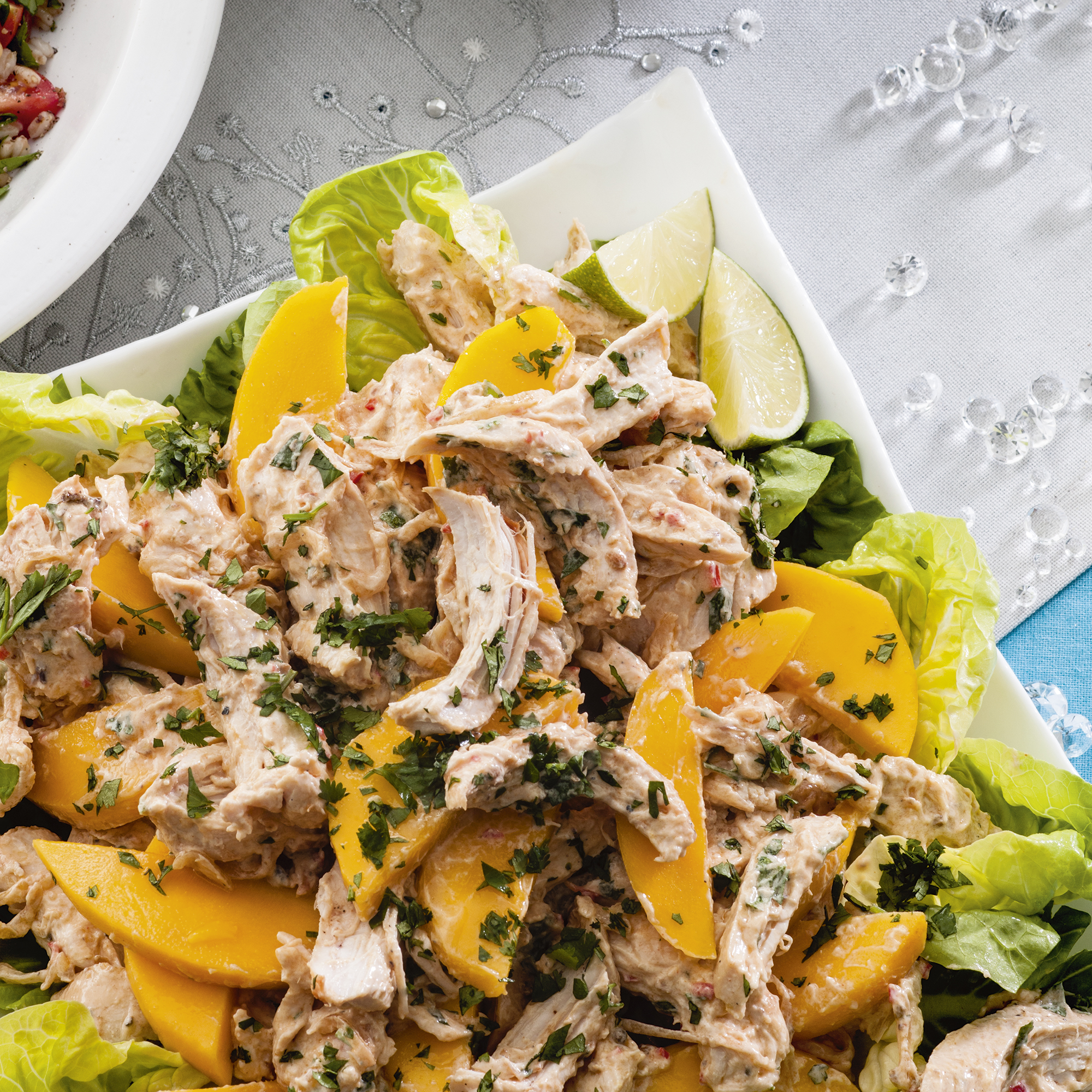 Indian spices, light yoghurt dressing and mango slices - spiced chicken and mango salad is a wonderful update on coronation chicken.