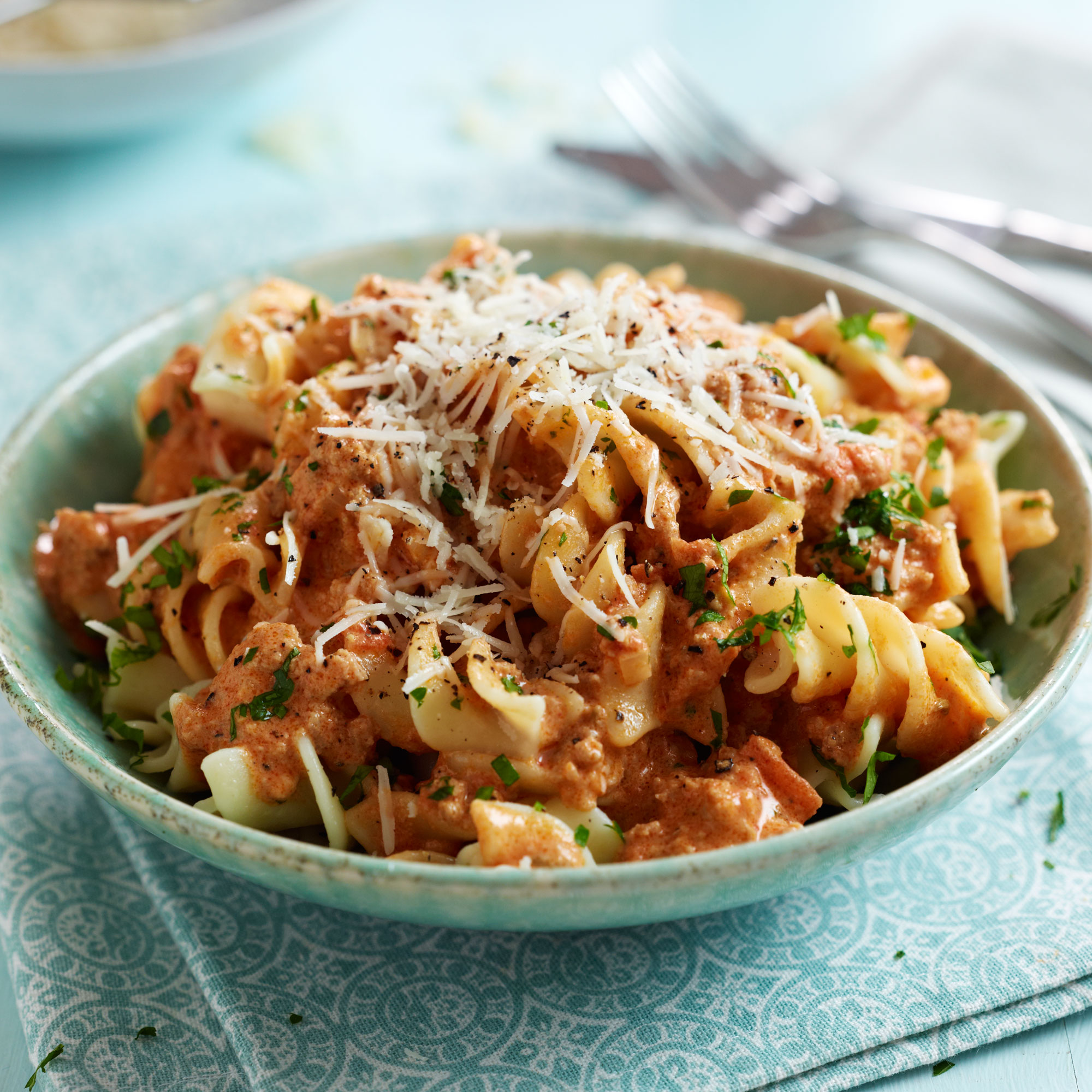 How to store and serve: Make the recipe up until the step where you are asked to add the cream, this is best added at the last minute before serving, so if you're planning ahead leave this bit out and take up the instructions from here when you're ready to go. Like all dishes with meat in them this pasta sauce should be left to fully cool before portioning up and freezing. We like to pop this into sandwich bags and freeze in individual portions so that it's easy to grab and go for a quick dinner. Heat through well once defrosted, add the cream and fresh parsley, and stir through a pasta shape like fusilli, which is easy to eat but will also capture the sauce beautifully. Finish with a generous helping of parmesan.