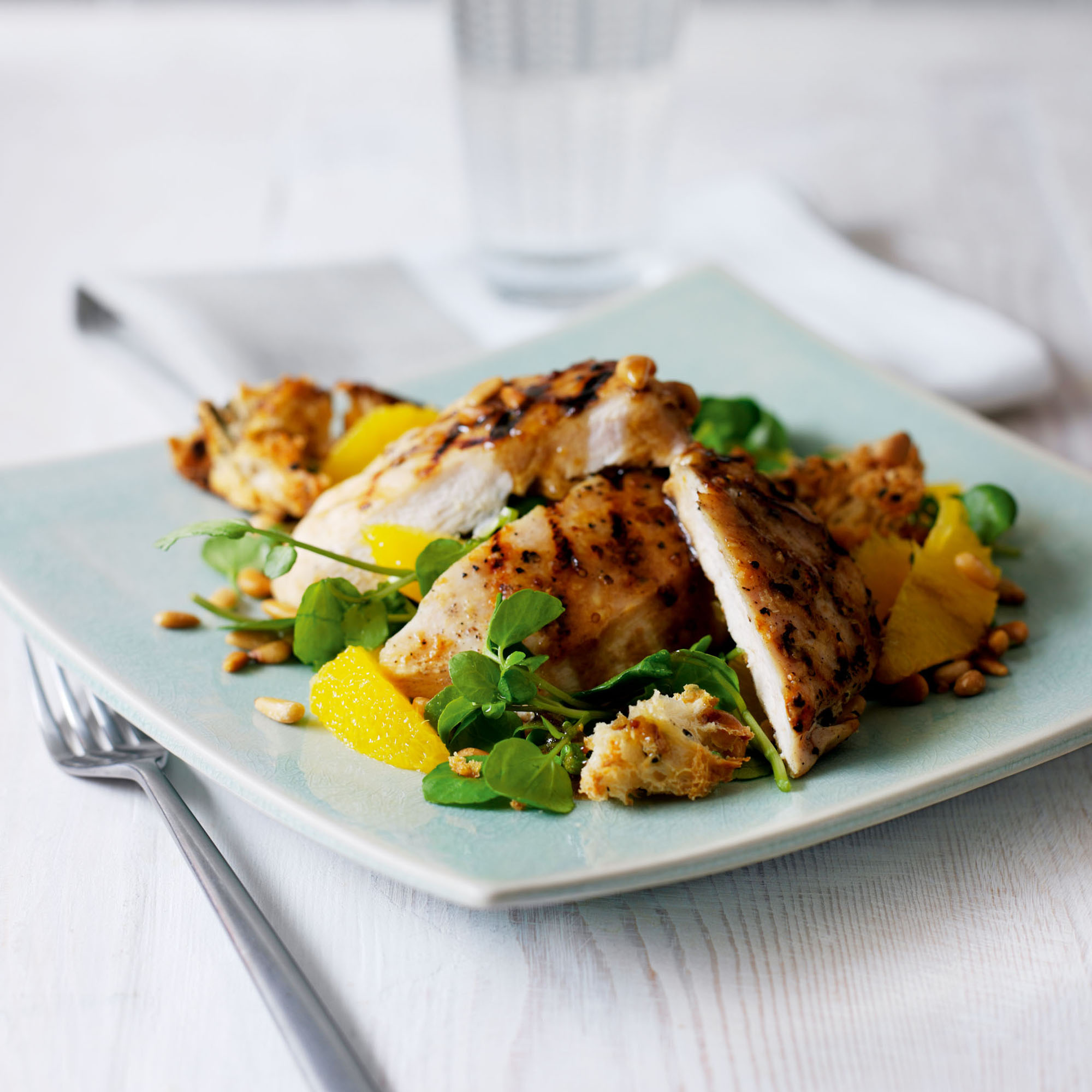 Our refreshing chargrilled chicken salad recipe is really tasty and it's full of delicious watercress, orange and pine nuts.
