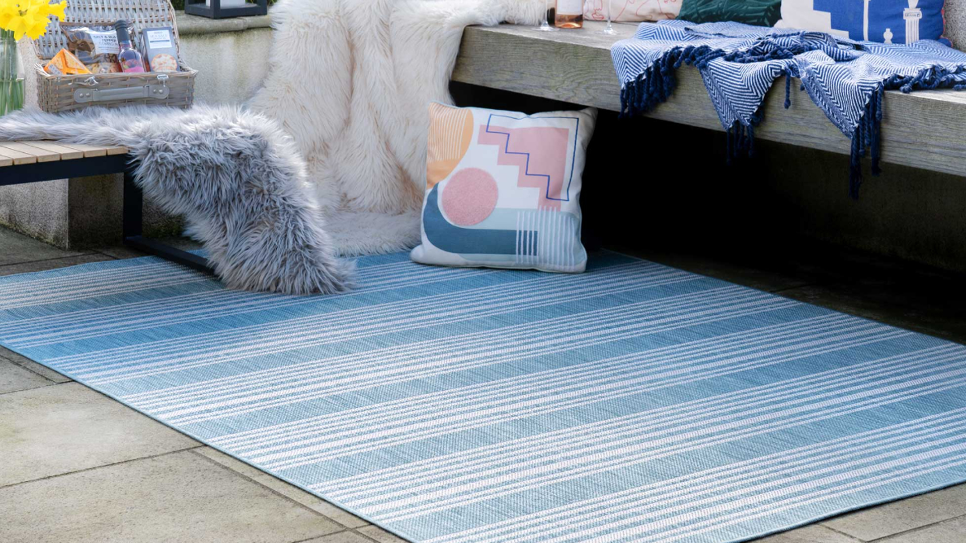 A simple monochromatic stripe can be all that's needed to add a stylish touch to a minimalist outdoor space. While adding interest, the black and white colour scheme doesn't overcomplicate or distract from your outdoor furniture and furnishings. If you want the stripes going the other way in a barcode style, take a look at Wayfair's rug.