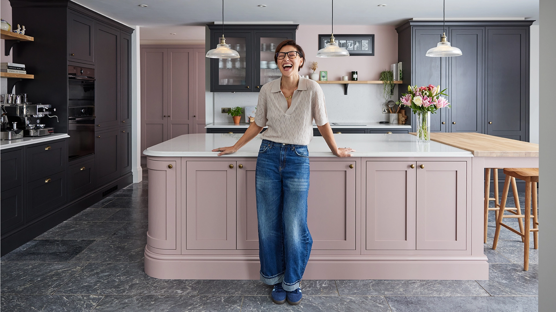 It was love at first sight when snaps of Emma Willis' kitchen makeover landed in my inbox. From the striking contrast of the dusky pink island against the brooding dark charcoal cabinets and the etched glass fronts to the impeccable layout, her newly refurbished space is bursting with stylish kitchen design ideas.