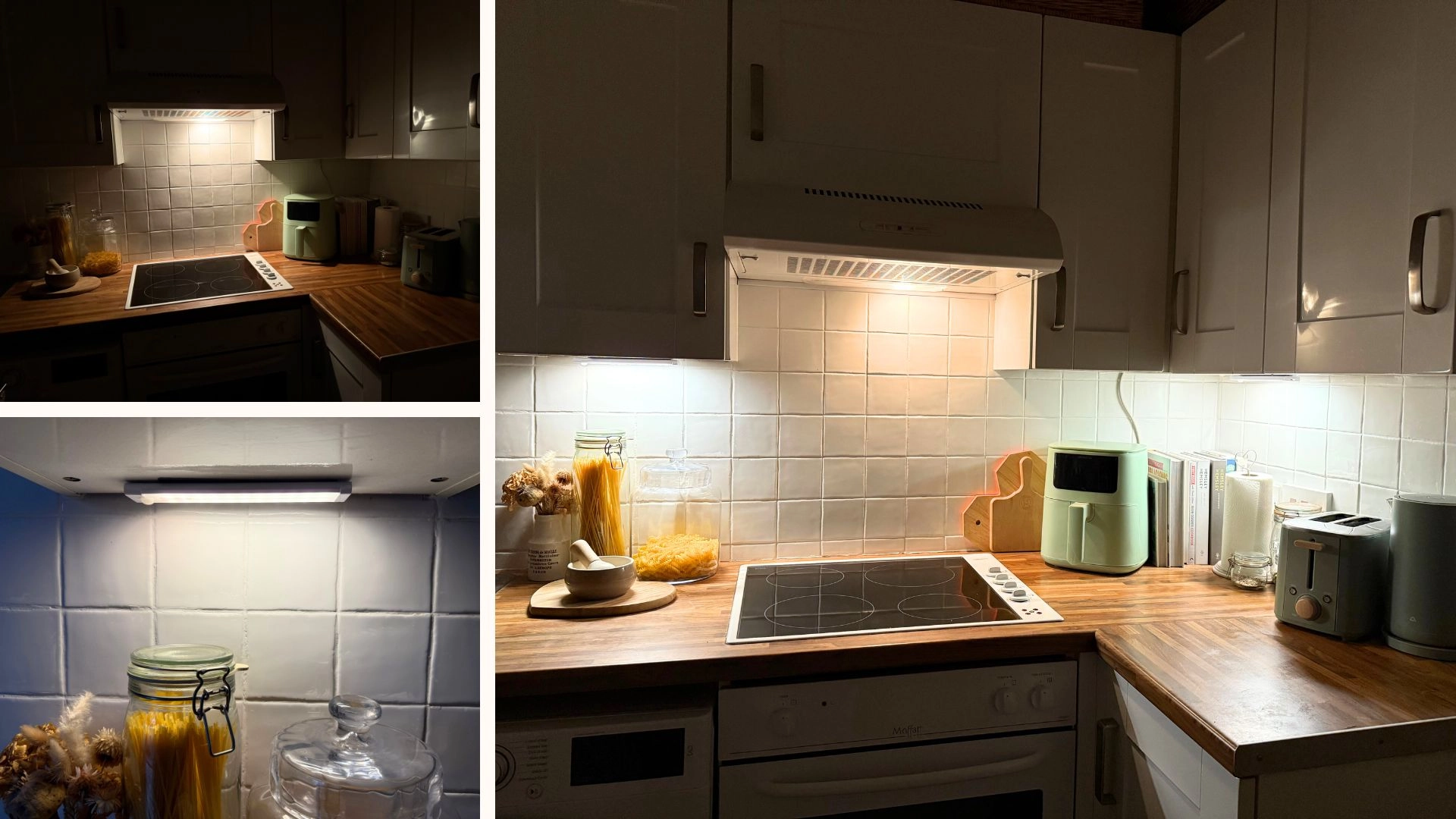 Left: the magnetic strip Right: the light in place and casting an ambient glow onto the countertop below
