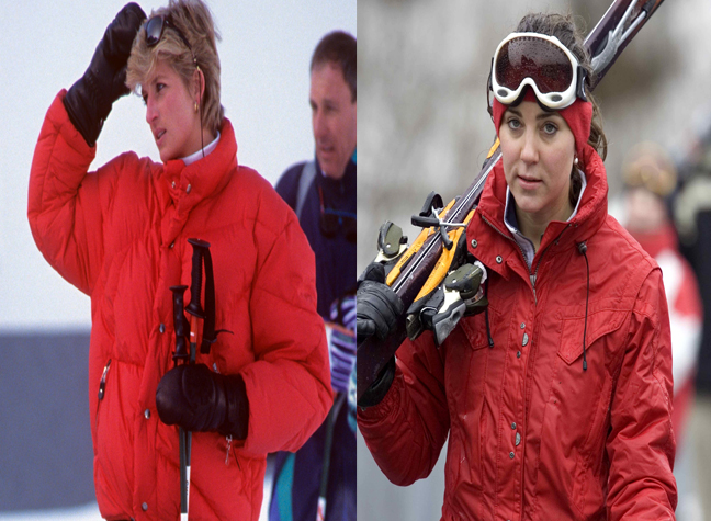 Kate is determined to be the lady in red even when on holiday. Like Diana, the Duchess of Cambridge loved skiing and often hits the slopes with William. Kate wore this red jacket the second time she went to Kloisters with William and it's very similar to the one Diana sported at the same plush resort in Switzerland back in 1986.