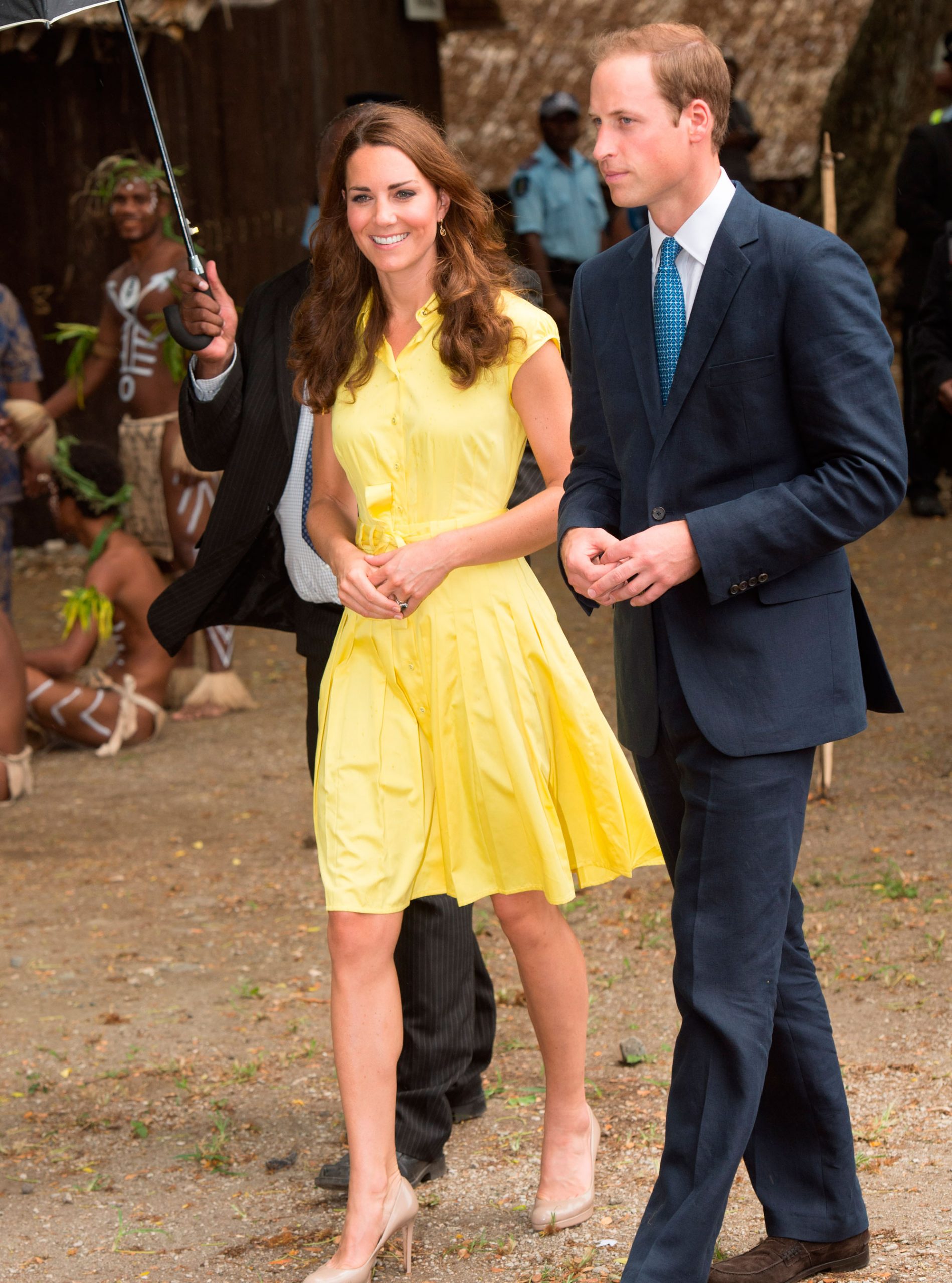 Stepping out for a tour of the Cultural Village in the Solomon Islands, Kate opted for a low-key, £180 Jaeger dress and her favourite nude LK Bennett shoes. The sunny yellow hue was perfect for the exotic South Pacific island. WIlliam looked dapper as always in a navy suit and bright blue tie. See Kate Middleton's style photos