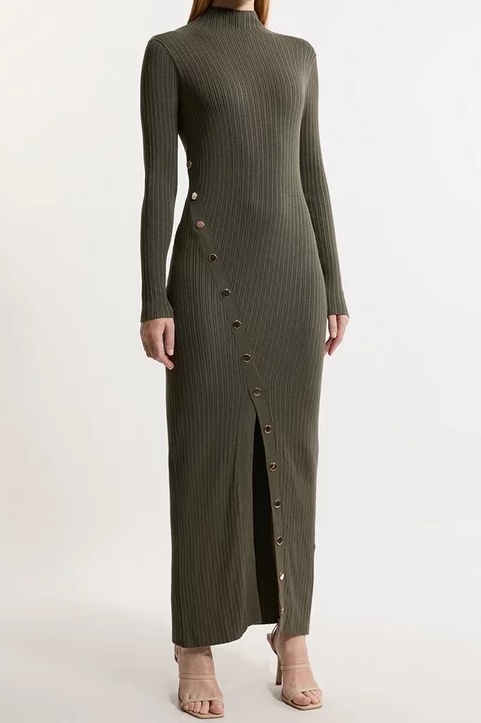 This gorgeous knitted midi dress comes in a variety of colours, but the ecru shade is neutral and easy to style. It's made from merino wool and organic cotton and has a high neckline and a split at the bottom that is closed by a button placket. With a pair of knee high boots and a trench coat, this would be a lovely spring outfit.