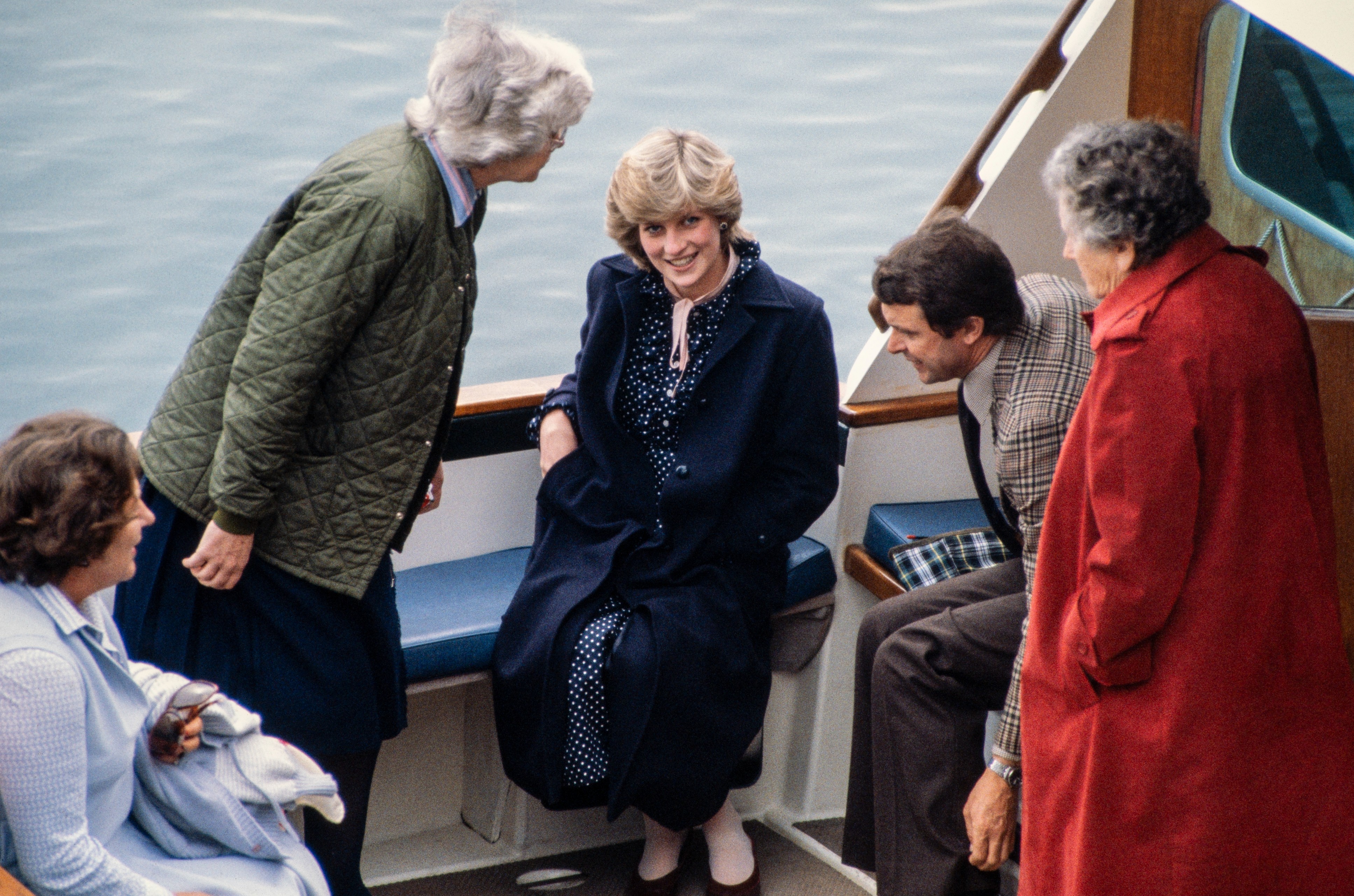 Princess Diana on a boat in St. Mary's, Scilly Isles, on April 20, 1982.