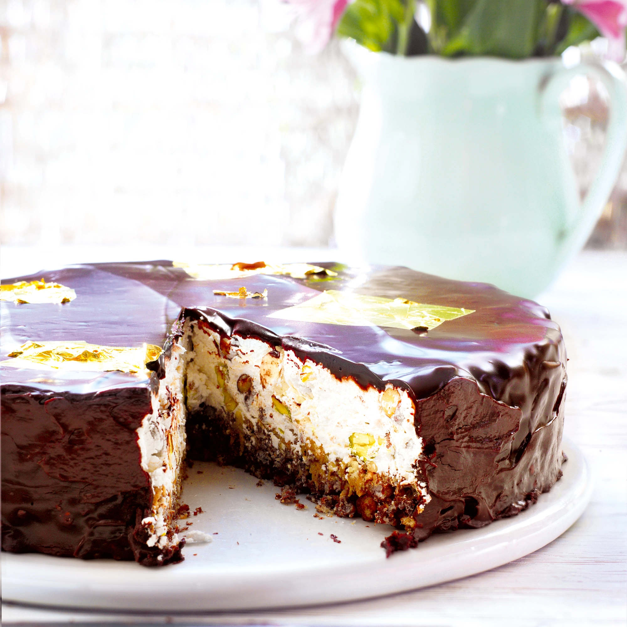 - For the glaze, put the chocolate, syrup, butter and 60ml water in a heatproof bowl set over a pan of gently simmering water. Once it’s melted, remove from the heat and whisk until smooth, but don’t over mix! Allow to cool slightly and thicken, for around 5-10 minutes. Run a sharp knife around the edge and carefully remove the tart from the tin. Pour over the sauce to cover and leave to set for 2 hours before serving. Then add the gold leaf if you like - use a dry fine paintbrush to apply it – but don’t touch it with your hands or it will crumble.