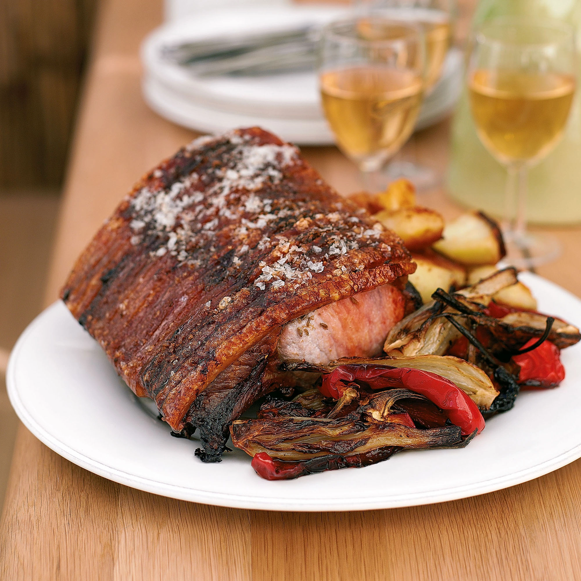 Put the pork into a roasting tin, rub a little oil into the skin and scatter over some Maldon salt. Roast for 20 minutes, then turn the oven to 180 C, 160 C fan, 350 F, gas 4 and roast for 2 hours 10 minutes (calculate 25 minutes per 450g/1lb). About 35 minutes before the pork is ready, put the fennel and peppers into a roasting tin and put in the oven.