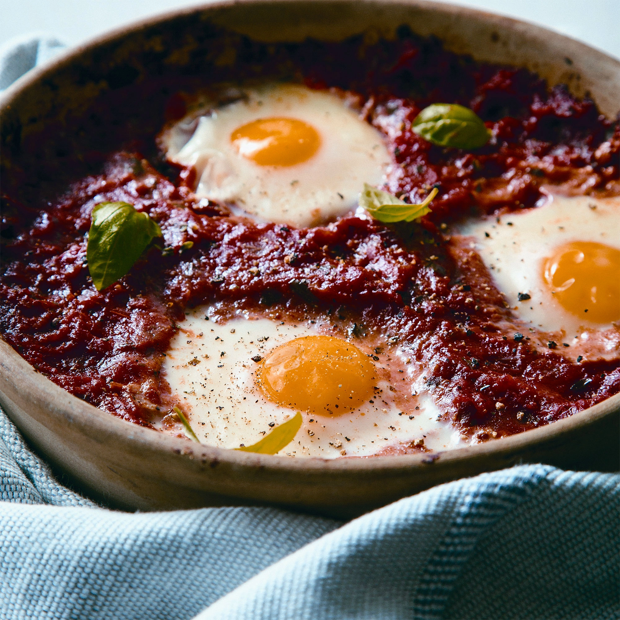 Heat the tomato sauce in a small saucepan. When warm, transfer it to a baking dish and stir in the fresh herbs. Create four indentations in the sauce, and carefully crack an egg into each one. Bake the mixture for 10 to 12 minutes, depending on how you like your egg yolks cooked. Remove the pan from the oven and sprinkle everything with a dash of sea salt